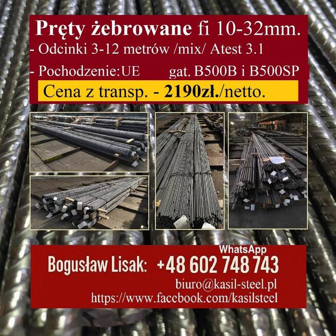 Oferujemy nowe pręty żebrowane prosto z huty o średnicy fi 10-32 mm. Pochodzenie: UE, Pierwszy gatunek B500B i B500SP. ...