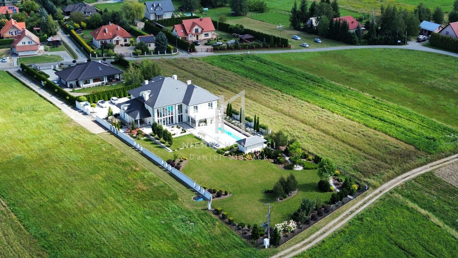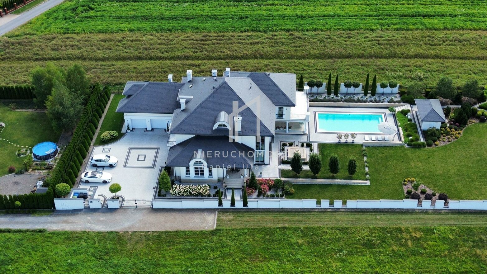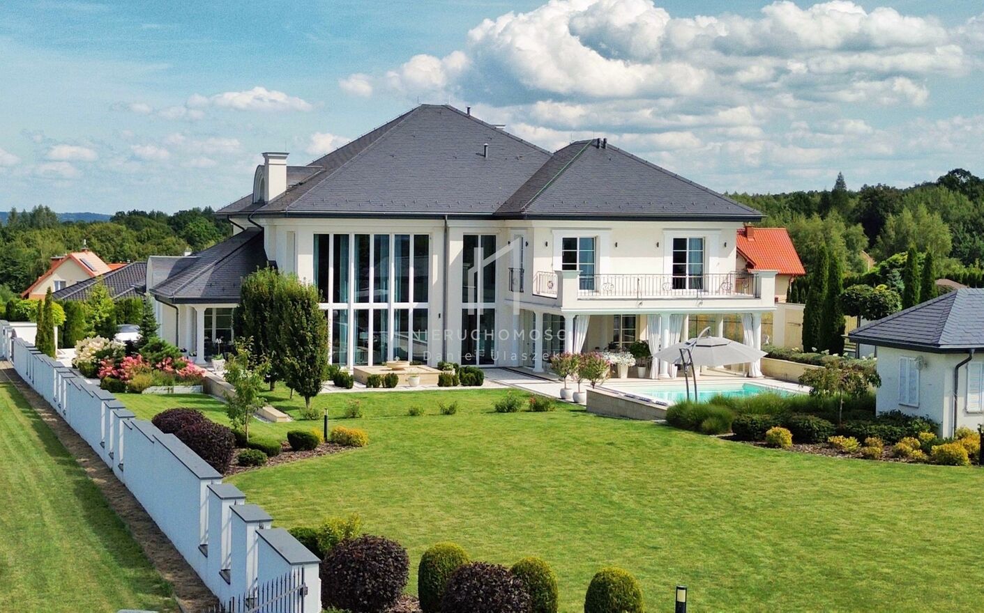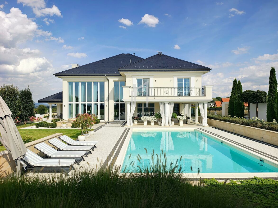 Okazała willa o powierzchni zabudowy 499 m położona jest na działce liczącej 3382 m (~34 arów), posesja otoczona pięknie zagospodarowanym ogrodem wzbogaconym o starannie dobraną i bujną, wielogatunkową roślinność. Całość dopełnia reprezentacyjny, panoramiczny taras wraz z basenem o powierzchni ok. 236m i pawilonem odpoczynkowym. Dom oferując nowoczesne rozwiązania technologiczne oraz luksusowe wykończenia z najwyższej jakości materiałów sprowadzonych głównie z Włoch i Niemiec.