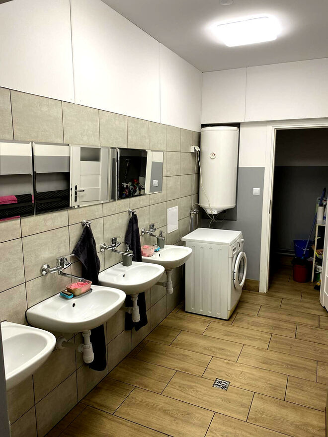 d/ łazienka / myjnia o powierzchni ok. 9m2 wyposażona w prysznic i pralkę,