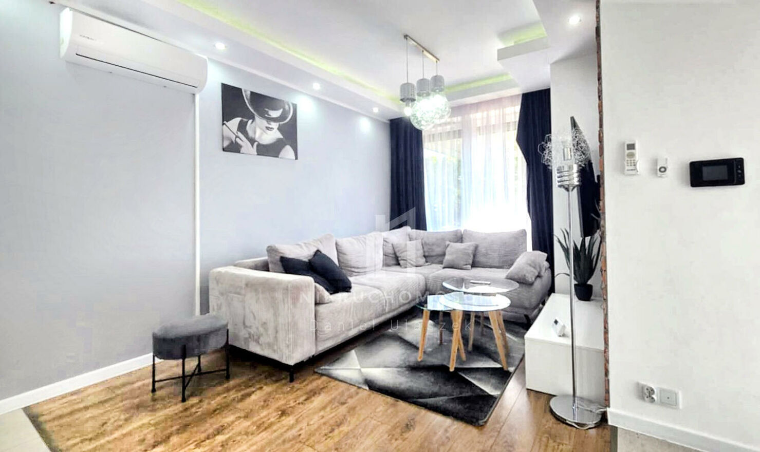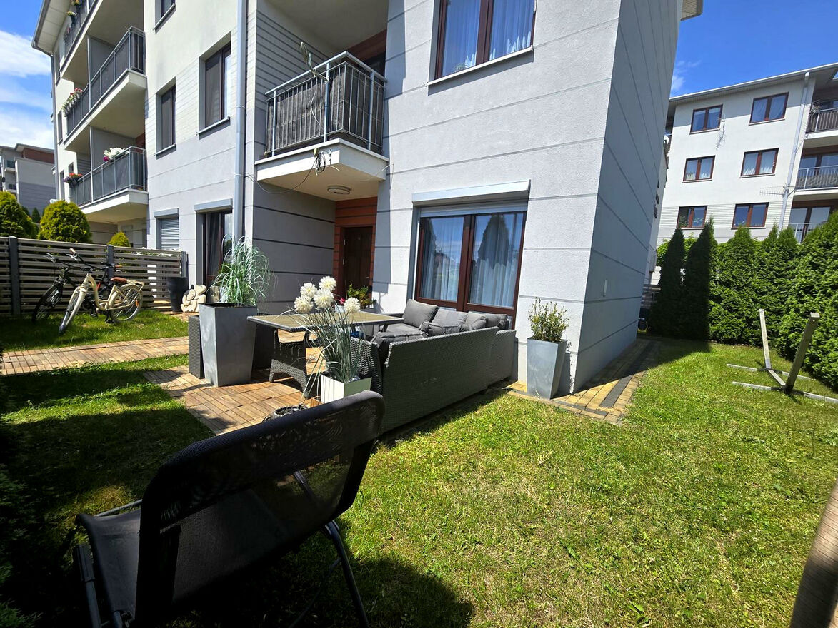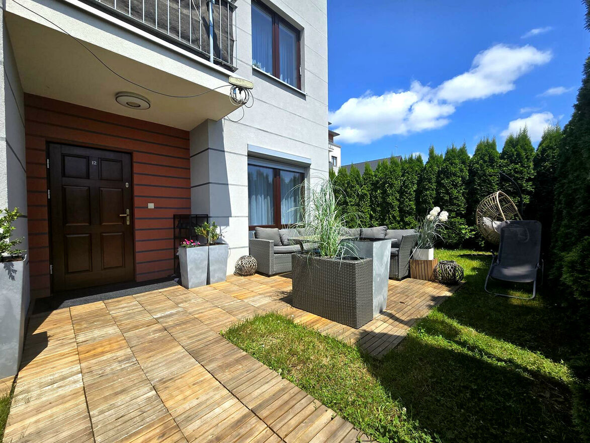 Na ustawny rozkład pomieszczeń w mieszkaniu składa się: wygodny salon z aneksem kuchennym wyposażonym w kompletny osprzęt AGD, jasna sypialnia z dużymi przeszkleniami z widokiem na przynależny ogród, mała sypialnia / pokój dla dziecka, garderoba, gustowna, duża łazienka z WC i prysznicem oraz przedpokój z pakowną szafą w zabudowie z dużymi lustrami, które optycznie dodają powierzchni.