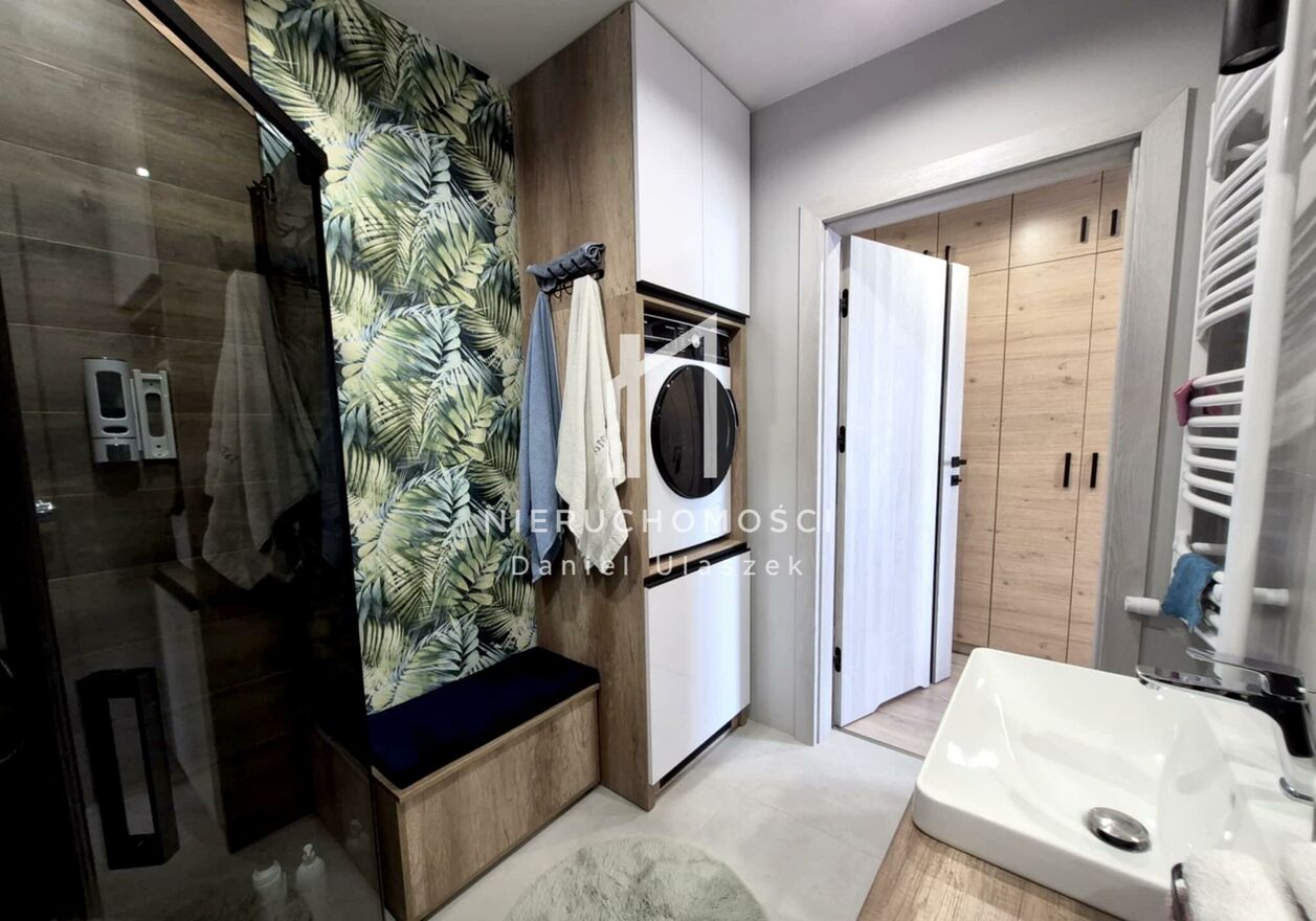 - elegancka łazienka z prysznicem i WC oraz pralką marki Amica w zabudowie