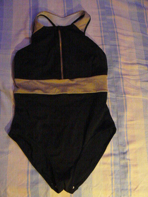 Do sprzedania uzywany kostium kapielowy Decathlon,jednoczesciowy,czarny z bezowa wstawka,zapinany na zamek z przodu,na wzrost ...