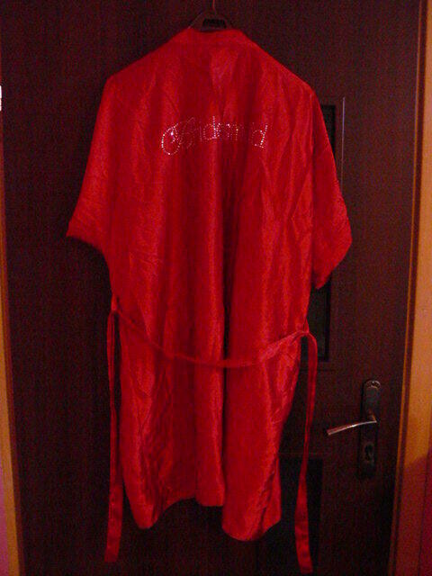 Do sprzedania uzywany damski szlafrok satynowy,czerwony,z paskiem,kieszenia,blyszczacym napisem z tylu.Nie ma rozmiaru ...