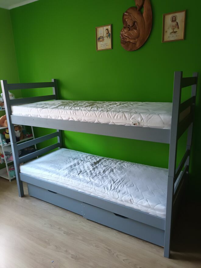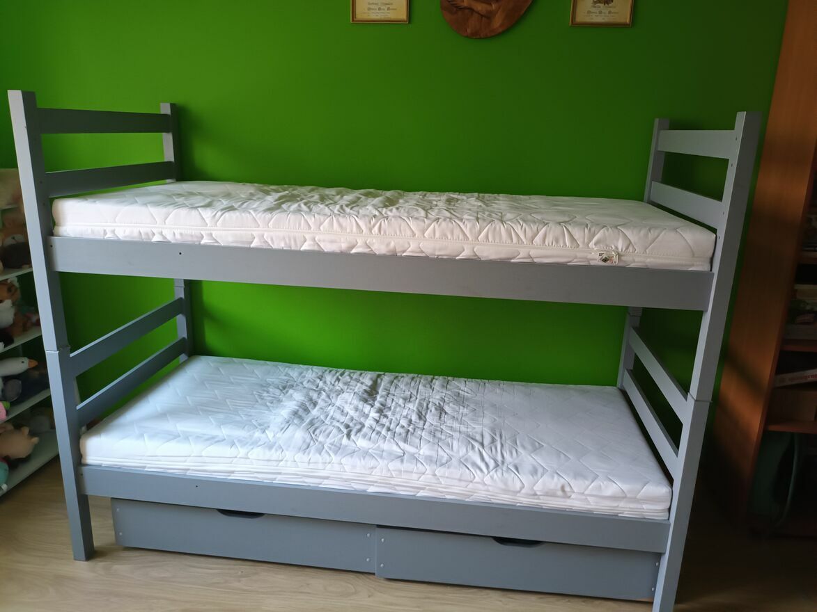 Sprzedam używane solidne łóżko piętrowe w bardzo dobrym stanie. Idealne do pokoju dziecięcego lub młodzieżowego. Łóżko jest bardzo bezpieczne,wygodne I pozwala zaoszczedzic duzo miejsca w pokoju. Istnieje możliwość rozłożenia na dwa pojedyncze łóżka. Konstrukcja wykonana z trwałego drewna.Wymiary: łóżka 90x200